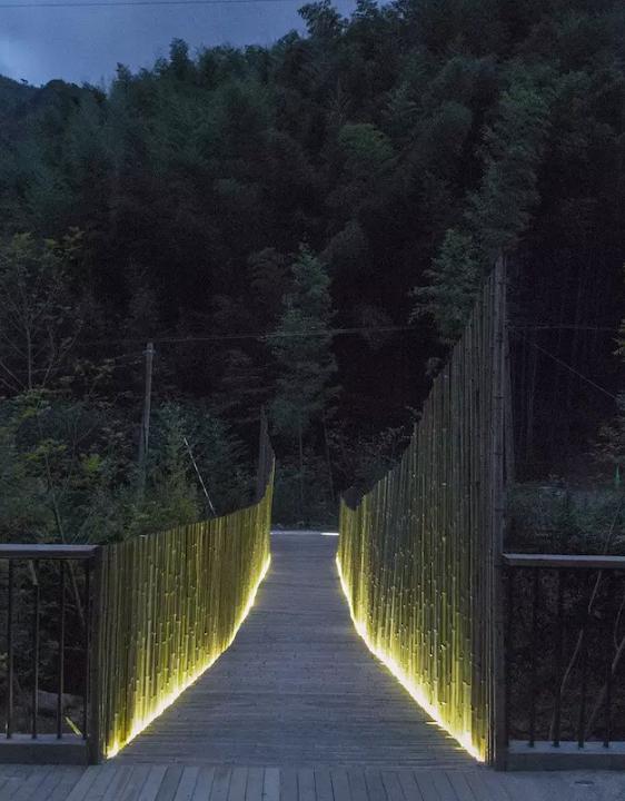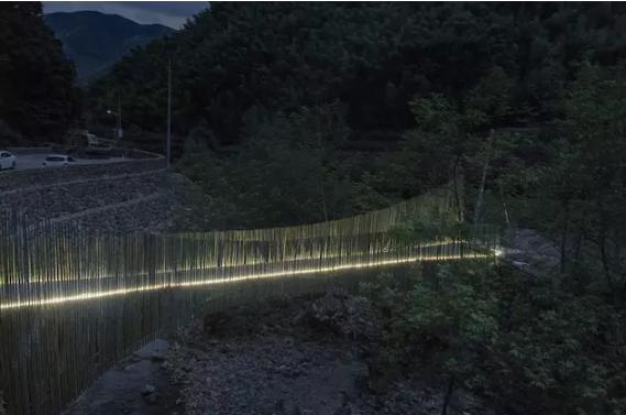 最終,在余姚中村小溪上架起的這座竹橋,僅花了 2.6 萬,其中 2.1 萬人工費,5000 元材料費。它造價低廉卻質樸優(yōu)美,僅有 1.2 米的橋身剛好是足夠一人走、另一個人側身而過的尺度,到了晚上,小橋上安裝的燈帶散發(fā)著微光,為它增添了一分別樣的美感。